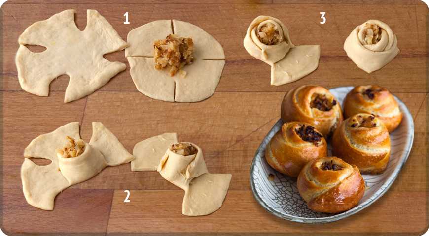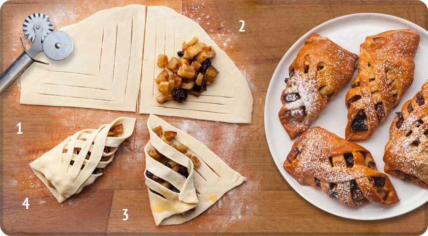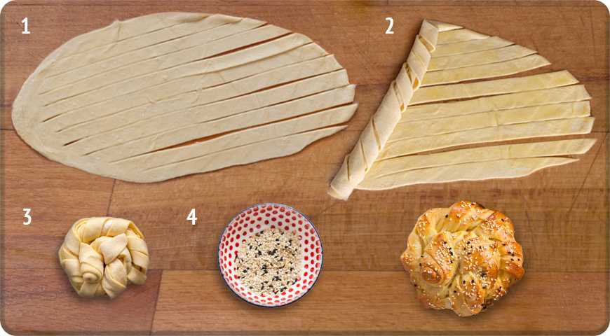 А вот самая привычная основа для всех пирогов и пирожков — пласт теста. Что можно с ним сделать, как вывернуть, надрезать и свернуть, покажем на примерах.