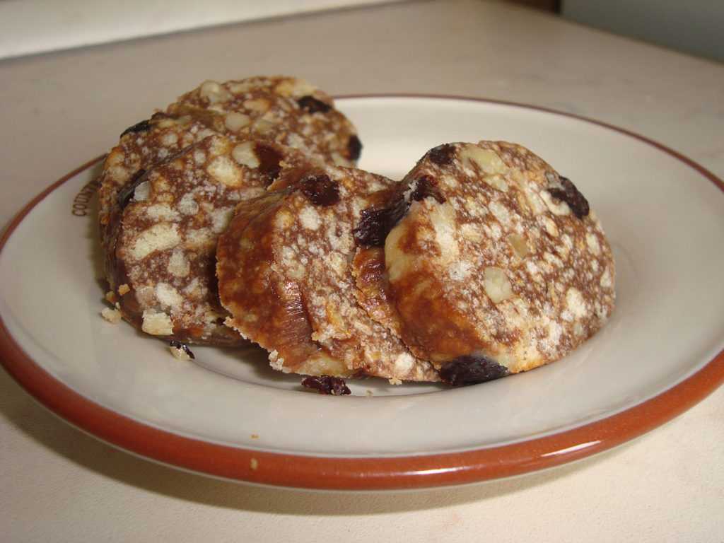 - Когда шоколадная колбаса полностью застынет, ее можно нарезать тонкими ломтиками и подавать к столу!