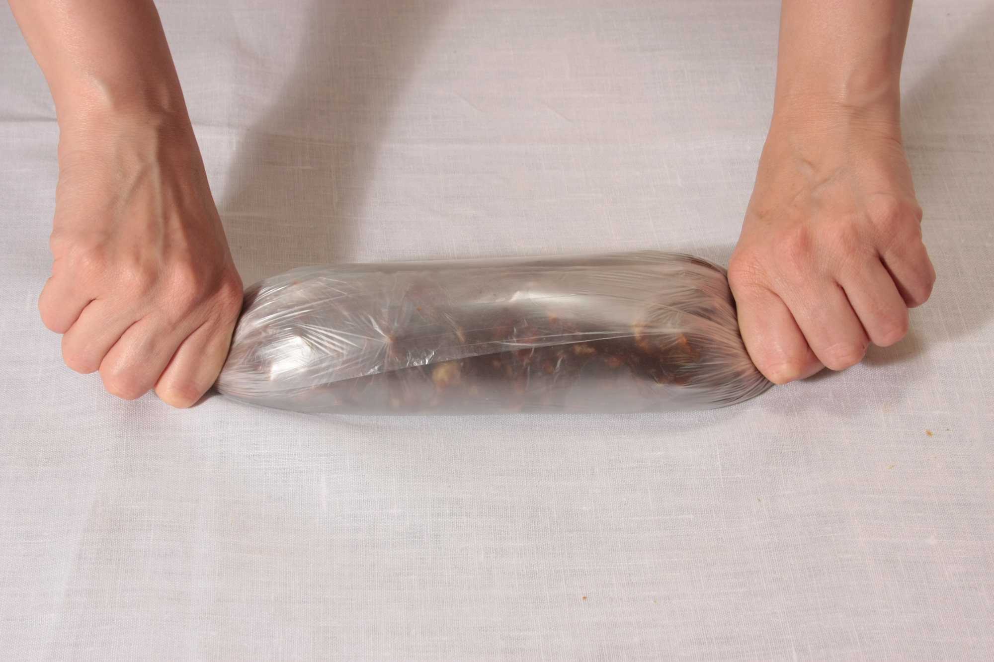 Выкладываем половину смеси и заворачиваем пакет. Хорошо завязывая концы.
