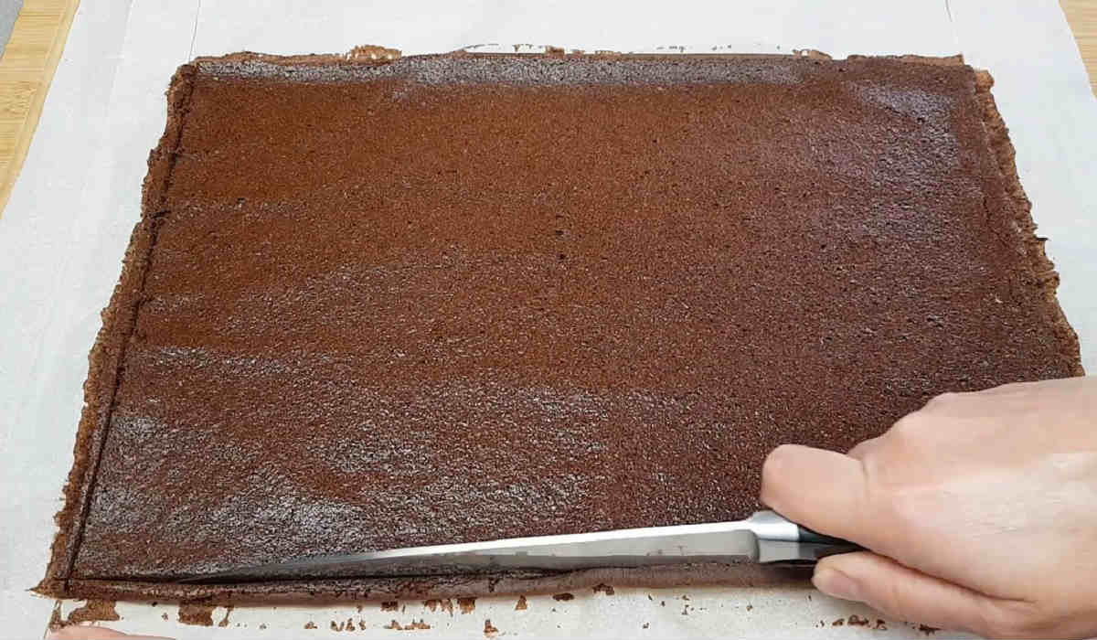 Выньте бисквит из духовки и сразу обрежьте края. Обрезки сохраните, крошка из них понадобится для оформления краёв рулета.