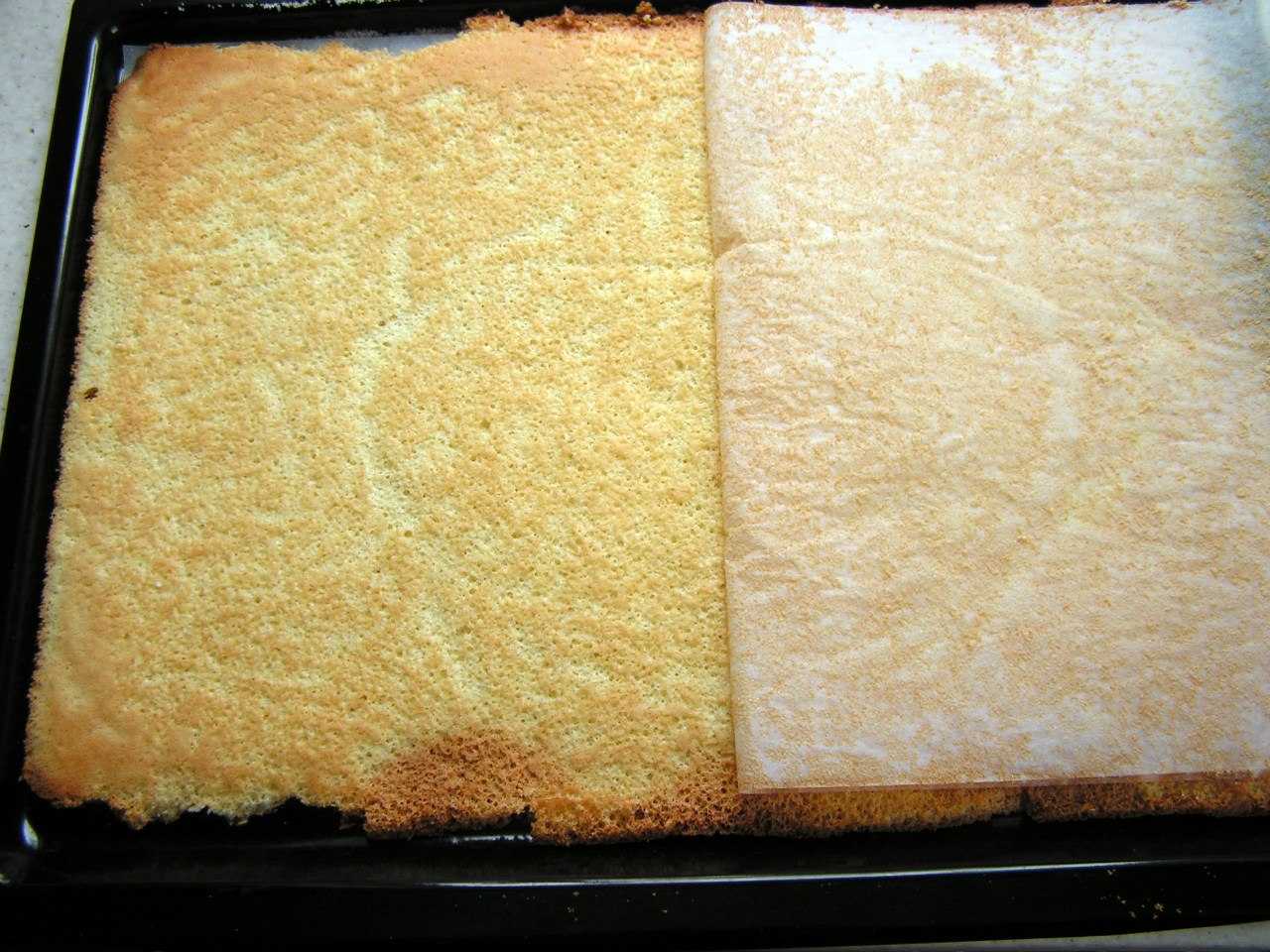 Готовый бисквит достаем из духовки, аккуратно переворачиваем на стол, бумагу убираем.