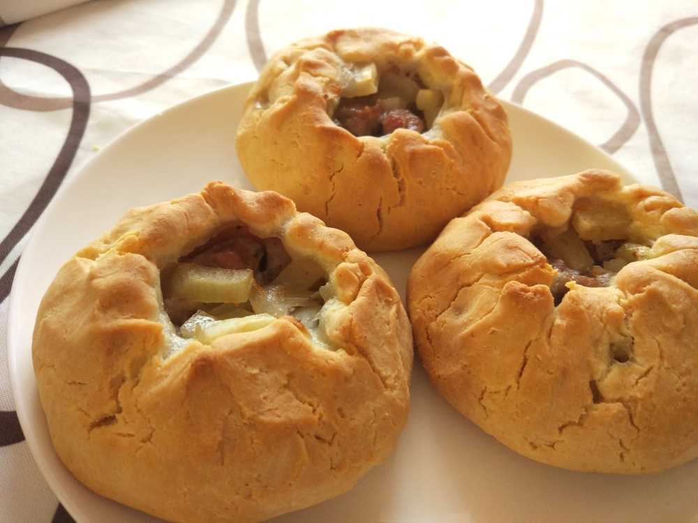 - Формируем из теста шарики, раскатываем пышки, раскладываем на каждую порцию по столовой ложке фарша. Приподнимаем края лепешки, не растягивая их, красиво собираем в центре, оставляя небольшое отверстие. Так оформляем все изделия.