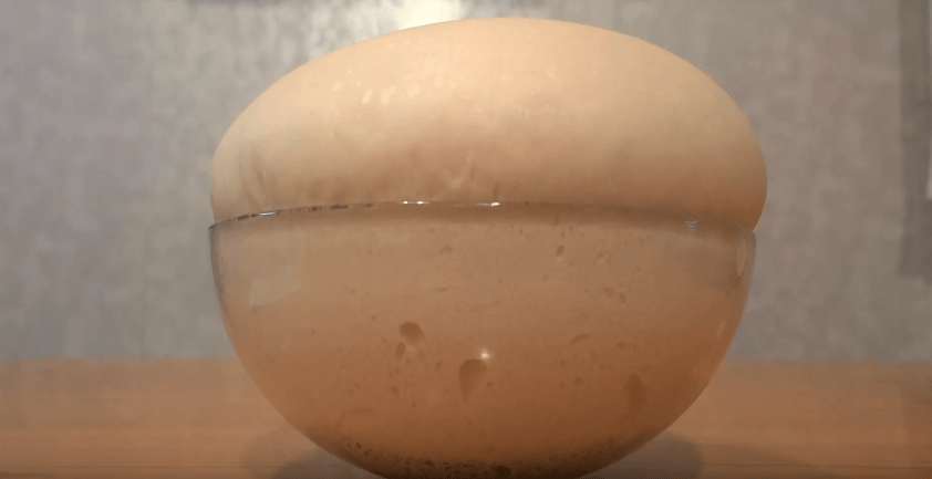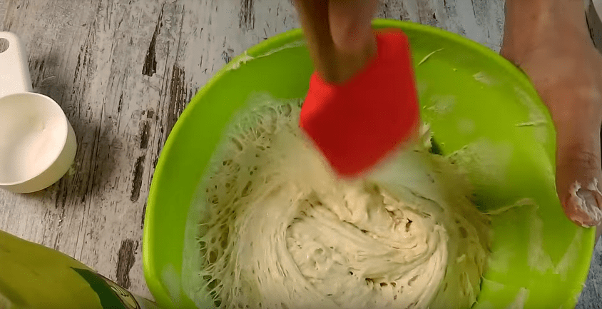 4. Смесь (опару) еще раз перемешиваем (обминка), чтобы выпустить образовавшийся углекислый газ и накрываем миску еще на часик.