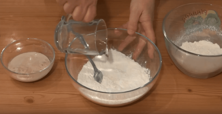 2. В миску, где начнем замешивать тесто, засыпаем половину подготовленной муки, щепотку соли и пол чайной ложки сахара. Перемешиваем и выливаем оставшуюся часть воды.