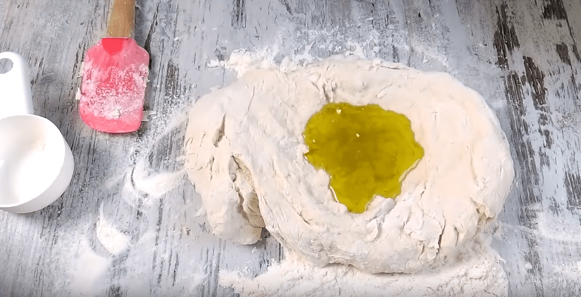 А когда оно приобретет более-менее однородную структуру- перекладываем его на стол. Делаем в нем углубление и заливаем в него оливковое масло и добавляем соль.