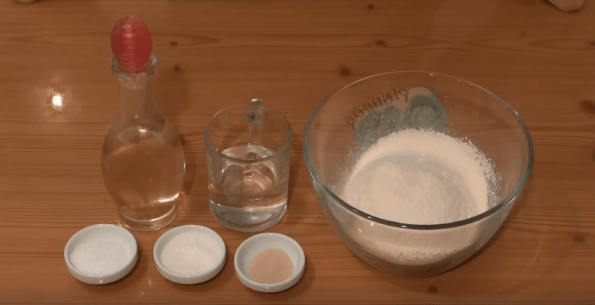 Давайте подготовим ингредиенты, чтобы сделать тесто по рецепту Оливера: 1,25 стак. теплой воды, 3,5 стак. муки, 2 ст. ложки масла оливы, 1 ст. ложка сухих дрожжей, морская соль – 0,5 ст. ложки, сахар – 0,5 ст. ложки.