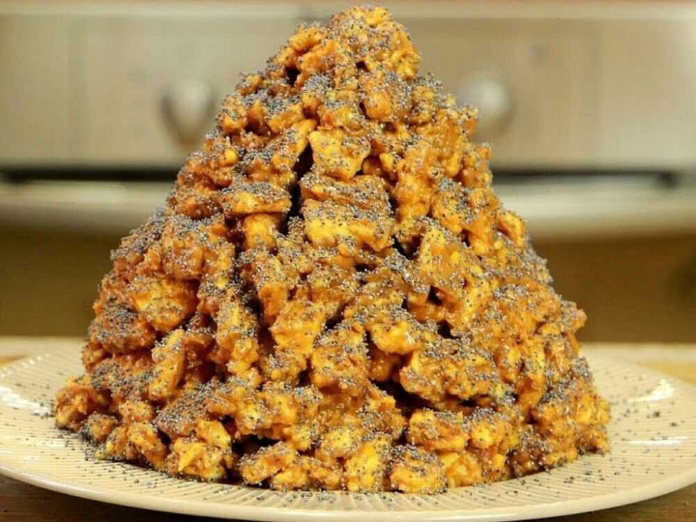 - Для того чтобы сформировать торт, кукурузные палочки нужно хорошенько «искупать» в соусе из ирисок. Для этого сладкая масса должна слегка остыть, но все еще оставаться довольно жидкой, чтобы палочки не превратились в кашу. Сформируйте из палочек горку, напоминающую муравейник по своей форме, можно сразу же посыпать тортик маком, после чего отправьте в холодильник, чтобы он немного охладился.