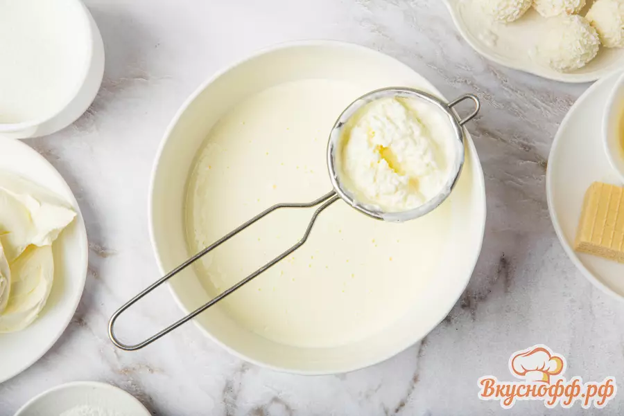 Шаг 2 Затем процедите сливки через сито. Взвесьте их на кухонных весах и при необходимости добавьте обычные сливки. Нам понадобится 290 мл сливок.
