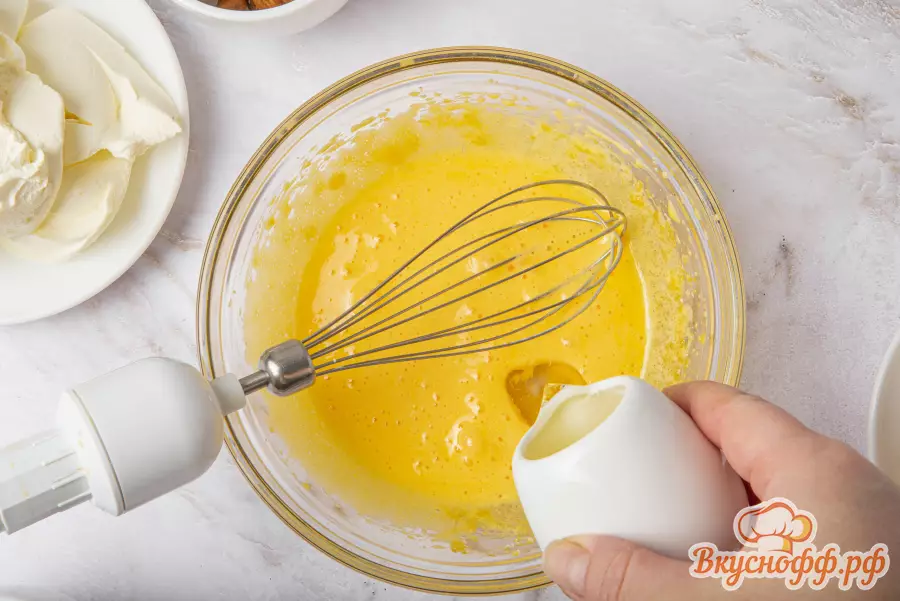 Шаг 7 В отдельной миске взбейте желтки с оставшимся сахаром до посветления. Сюда же влейте растительное масло и тщательно перемешайте массу миксером.