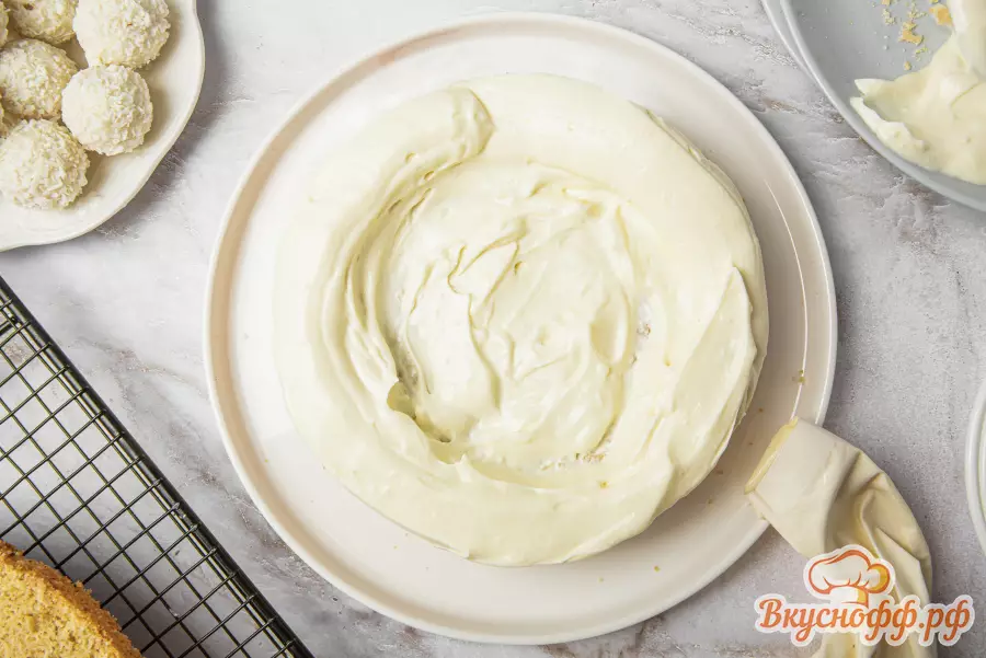 6. После того как кокосовый бисквит остыл, можно переложить его на блюдо и покрыть ванильным кремом.