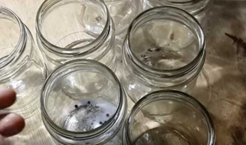 2. Подготовьте винтовые банки. Следите, чтобы все они были одной высоты. На дно каждой положите по ½ ч.л. соли, 2 горошины душистого перца, 5-6 горошин чёрного перца и кориандр.