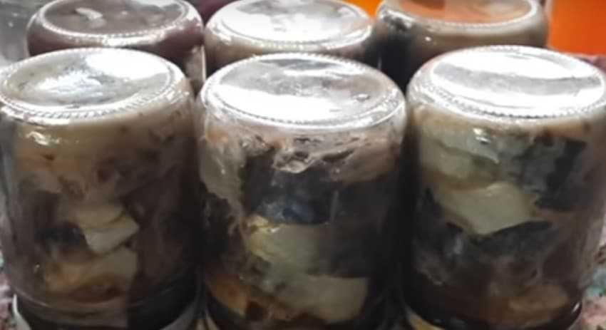 Поставить банки, прикрытые крышками в кастрюлю, на дно которой постелено полотенце. Налить теплой воды, чтобы уровень жидкости покрывал две трети высоты банок. Довести до кипения и сильно убавить огонь. Готовить 3,5 часа. Затем извлечь банки по одной и закатать.