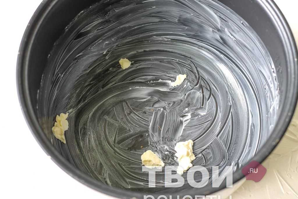 Берем форму для выпечки (можно не только круглую — у меня диаметром 24 сантиметра, но и квадратную или прямоугольную). Чтобы выпечка не прилипла, можно застелить форму пергаментной бумагой или сделать так называемую «французскую рубашку». Тонким слоем смазываем форму сливочным маслом, затем обсыпаем мукой, стряхивая излишки. Как вариант, можно просто смазать растительным маслом — тогда мука не нужна.