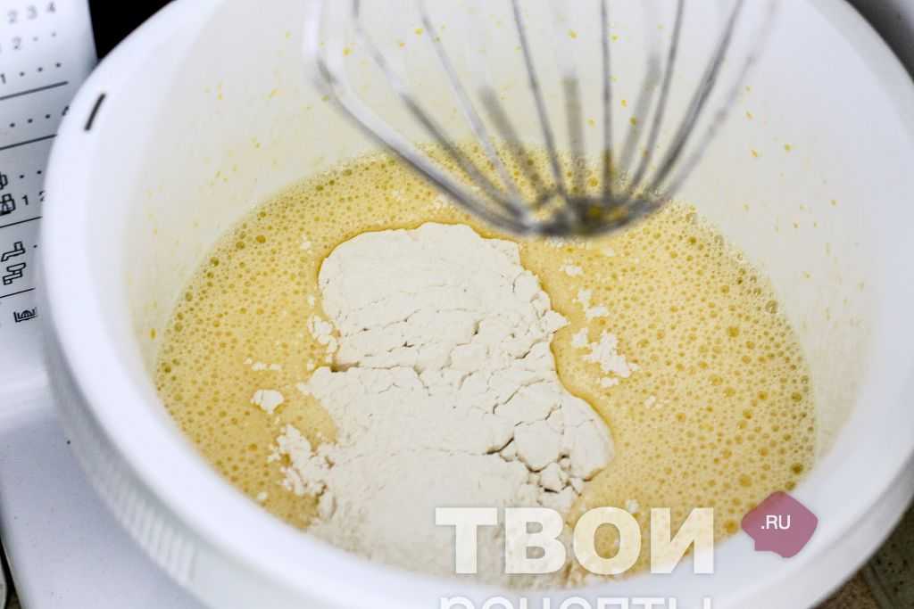 Затем всыпать разрыхлитель с пшеничной мукой, взбивая миксером на небольших оборотах или же ручными приспособлениями.