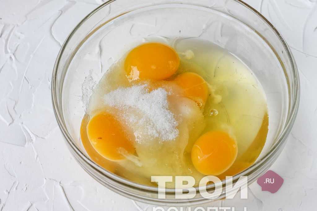 Затем приступаем к приготовлению теста. В чистую глубокую миску вбиваем нужное количество куриных яиц без скорлупы, добавляем к ним сахарный песок, ванильный сахар и слегка взбиваем ингредиенты венчиком в течение 3 — 4 минут до легкой пышности и почти полного растворения сахарных крупинок.
