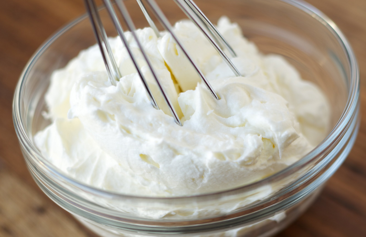 - В отдельной миске взбейте сливки до образования плотных пиков.