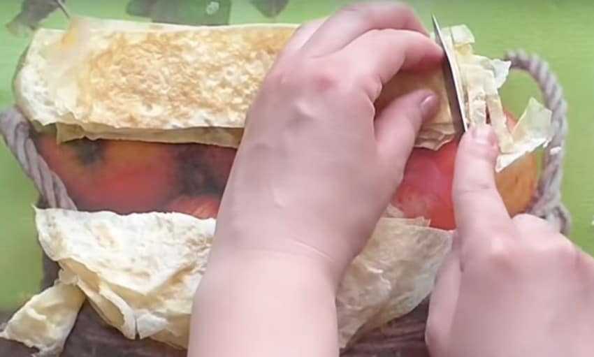 - Ещё тёплыми сворачиваем их в трубочки, затем тоненько нарезаем.