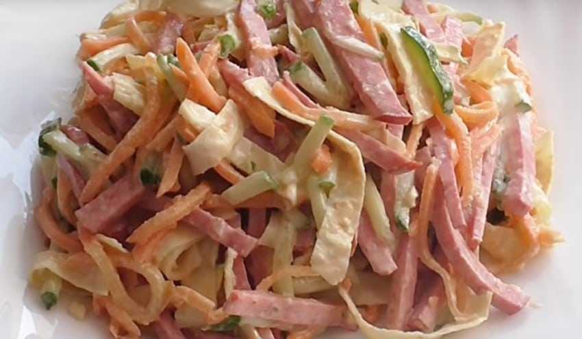 Рецепт салата с блинчиками из яиц с ветчиной и капустой