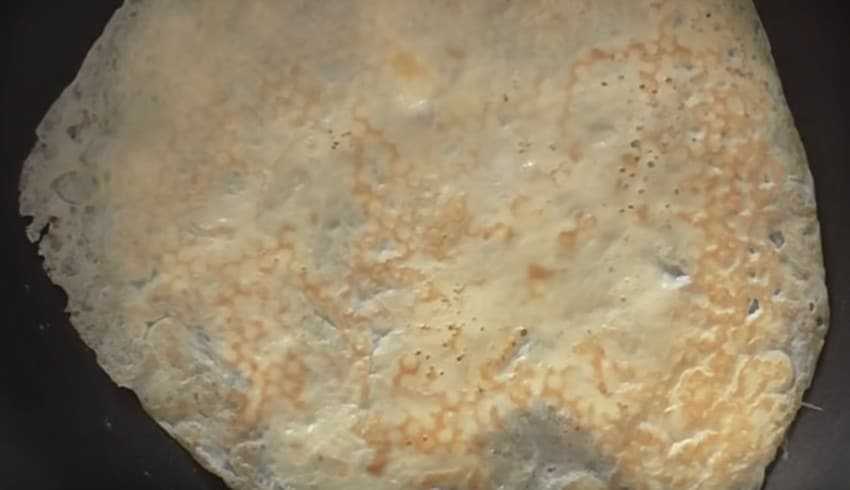 - После зарумянивания одного бочка блина, переворачиваем его на другой.