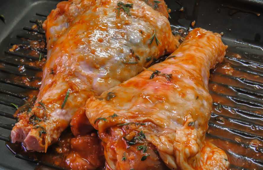 - Горчицу смешиваем с медом, полученным соусом хорошенько обмазываем ножку индейки со всех сторон.