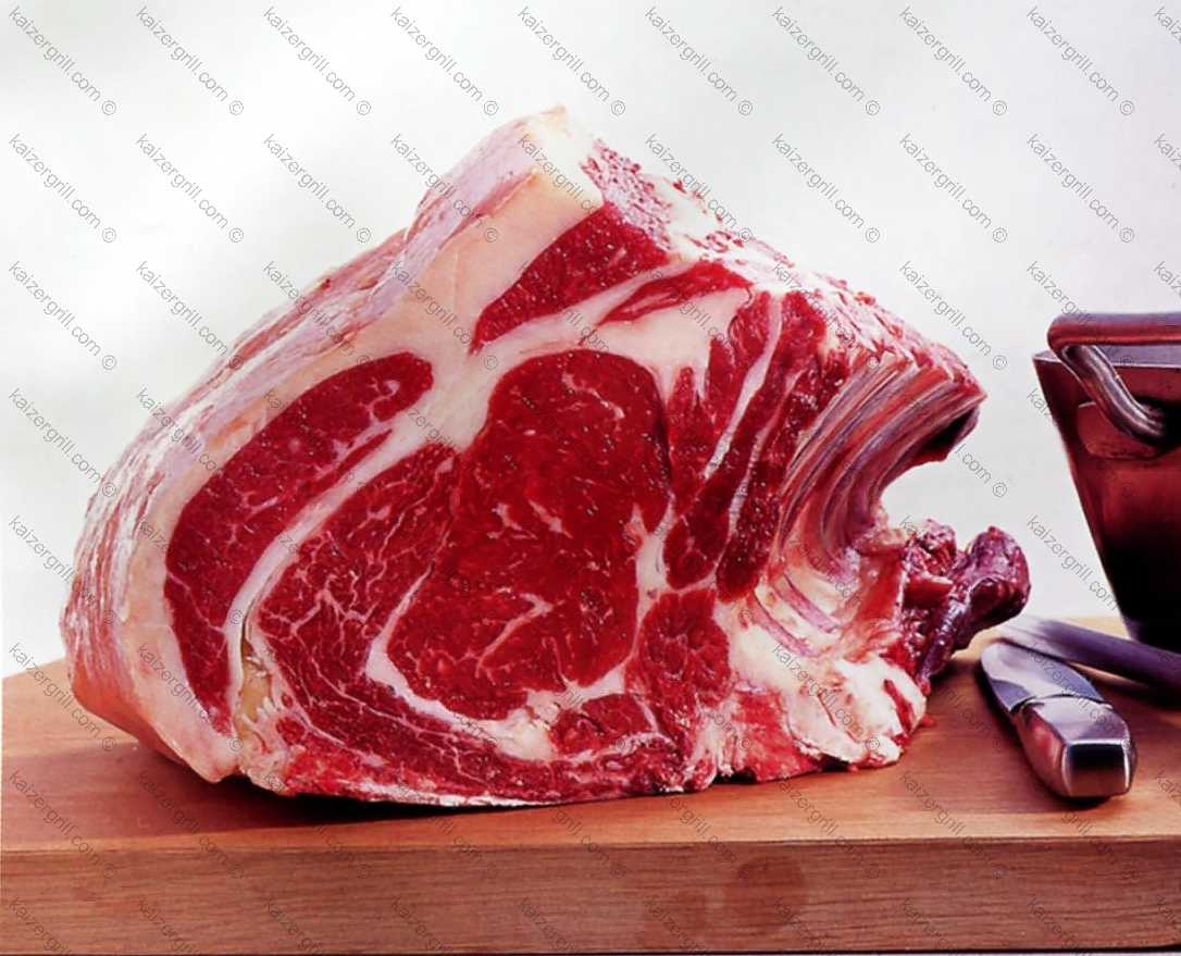 Такой должна быть говядина: это кусок антрекотной части с хорошей мраморной текстурой. Расположенный сверху толстый жировой слой сохраняет ценность мяса при приготовлении, но при желании его можно удалить перед подачей.
