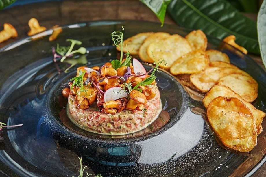 Тартар из говядины с лисичками и картофельными чипсами