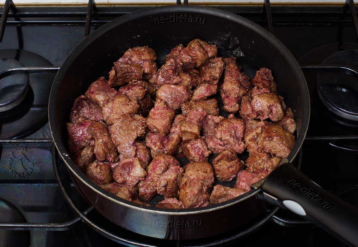 3. Добавляем печень, обжариваем вместе. Субпродукт режем кубиками не более трех сантиметров либо аналогичными брусочками.