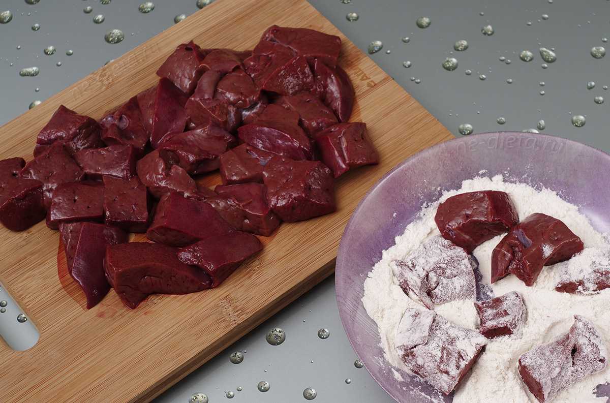 3. Теперь очередь печени. Режем ее как угодно, но лучше не очень крупно. Посыпаем мукой.