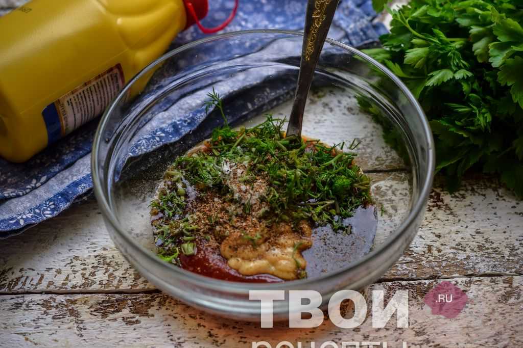 Подготовьте маринад. Для этого в отдельной емкости соедините соевый соус, томатную пасту, горчицу, паприку, красный острый молотый перец и сушеную зелень. Если у Вас нет томатной пасты, то ее можно заменить кетчупом или аджикой. Сушеную зелень выбирайте по своему вкусу, что больше любите, то и добавляйте.