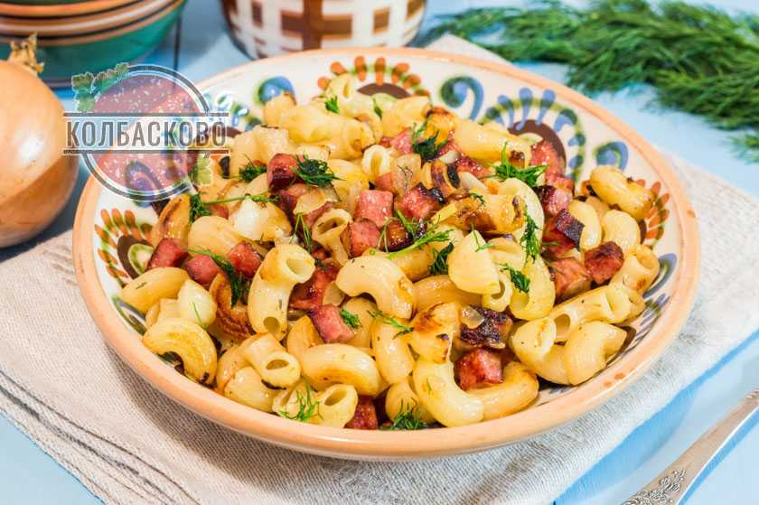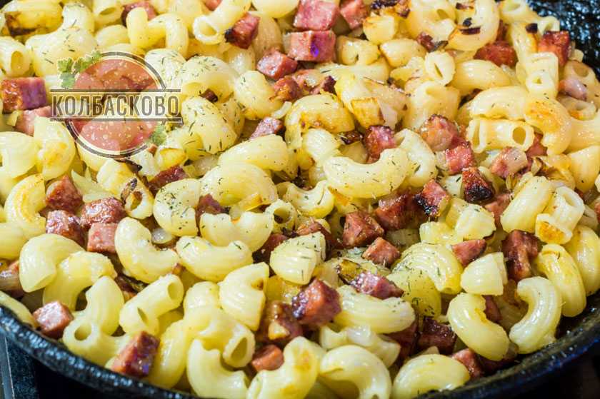 Жареные макароны с колбасой в томатном соусе готовы. Подавайте блюдо горячим!