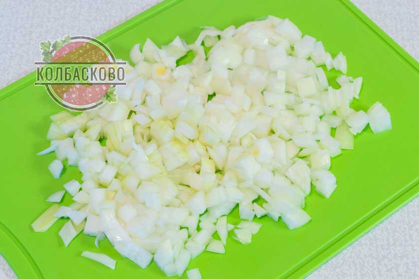 3. Репчатого лука в таком блюде много не бывает, поэтому можно взять пару головок. Очищаем его, споласкиваем под холодной водой и режем мелким кубиком. Чтобы не плакать от нарезки лука, например, можно набрать полный рот холодной воды или закрыть нос прищепкой для белья.