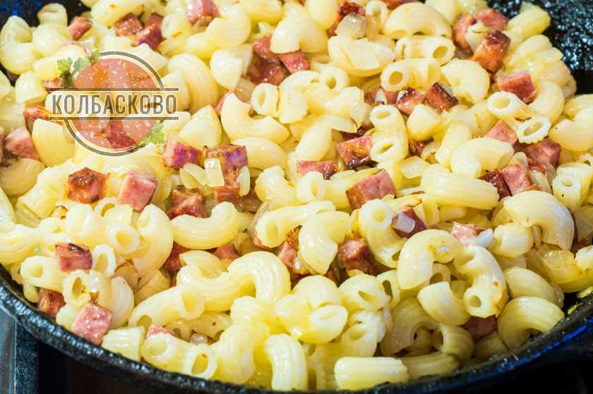 С готовых макарон слейте воду и выложите их на сковороду к колбасе и овощам. Хорошенько перемешивайте, не выключая огонь. Через 5 минут можно снять сковороду с огня.
