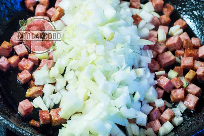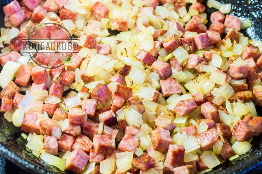 Лук обжариваем на сливочном масле при небольшом огне. В это время, маленькими кубиками нарезаем колбасу. Выбор колбасы к этому блюду имеет очень большое значение. Она должна быть вкусная. Как я писал выше, вместо колбасы можно использовать какой-нибудь мясной деликатес, например карбонат (опытные кулинары, думаю, догадались какое блюдо можно приготовить следующим шагом).
