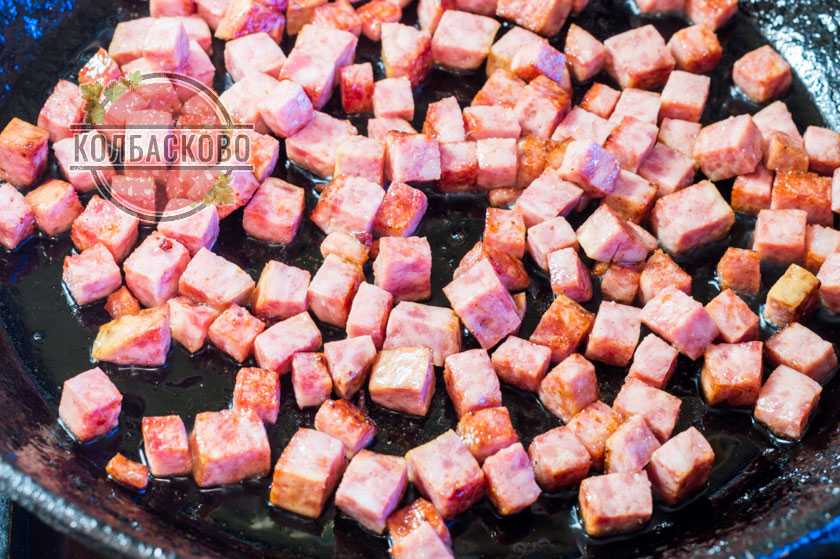 - Колбасу измельчим кубиком, обжарим на подсолнечном масле несколько минут.