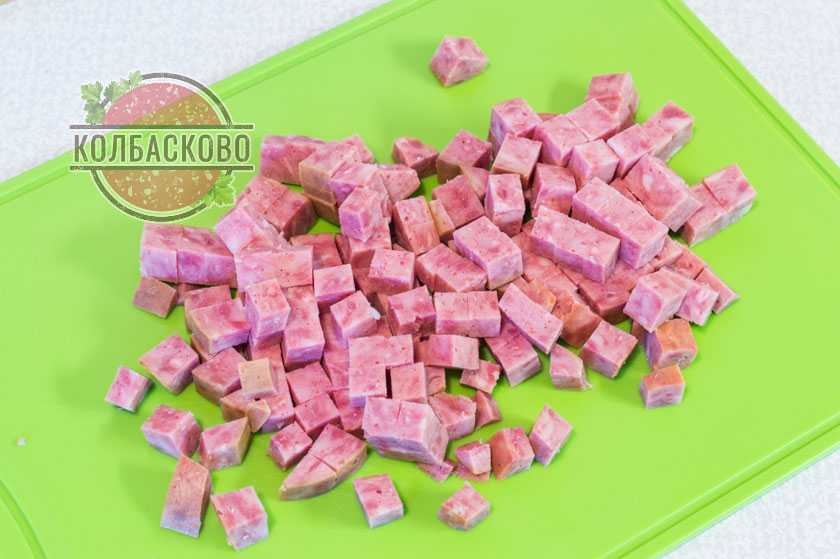 - Колбасу очистим от оболочки, затем накрошим соломкой или кубиками.