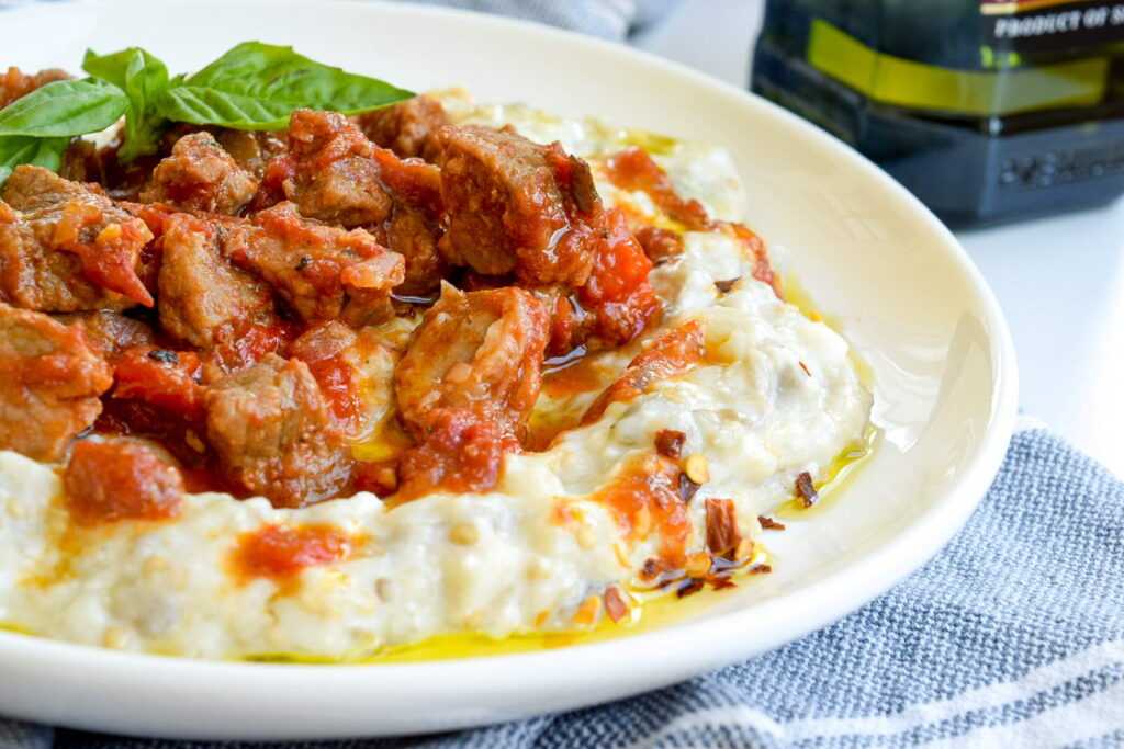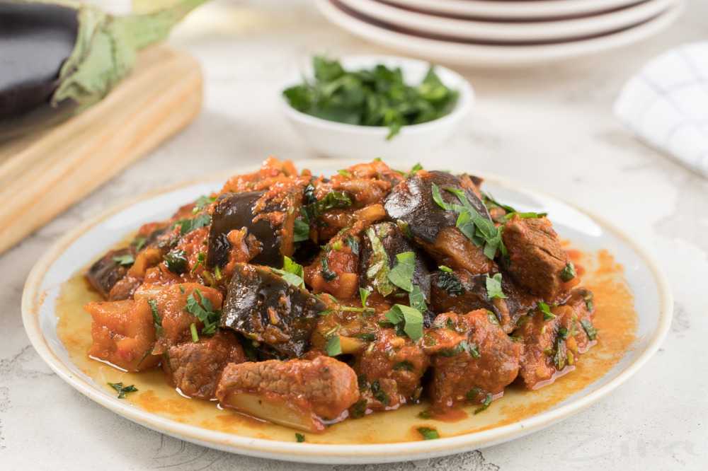 Есть 2 варианта подачи Хюнкар бегенди. Подать все на большом блюде или разделить на отдельные тарелки. Что бы вы ни выбрали, выкладываем пюре из баклажанов на тарелку и поливаем тушеным мясом.