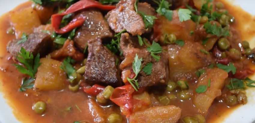 Говядина, тушеная на сковороде с картошкой и овощами