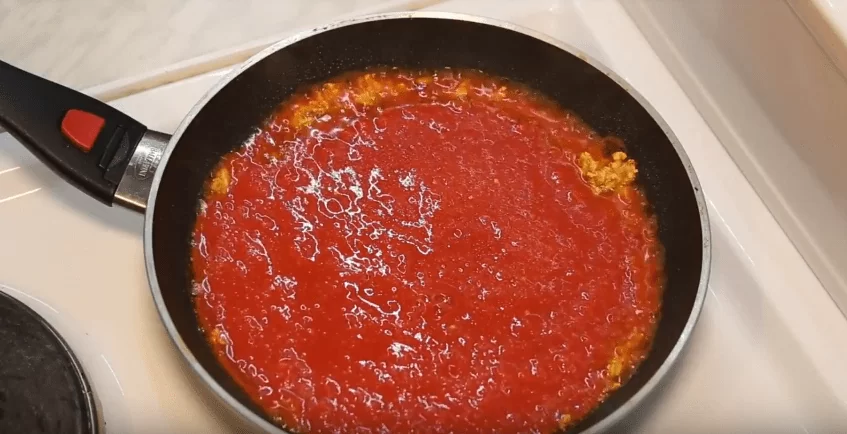 - Добавляем томатную пасту и варим, постоянно мешая, несколько минут. Добавляем все остальные ингредиенты, кроме сыра, доводим до кипения и снимаем с огня. Фарш и соус готовы.