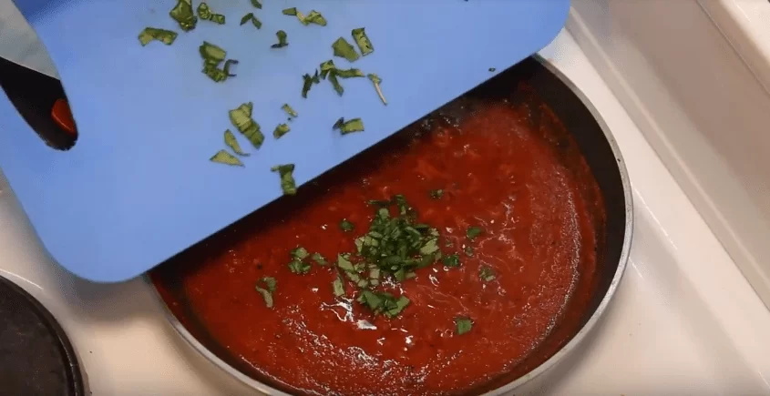 3. Когда соус загустеет, добавляем мелко нарезанные листья свежего базилика.