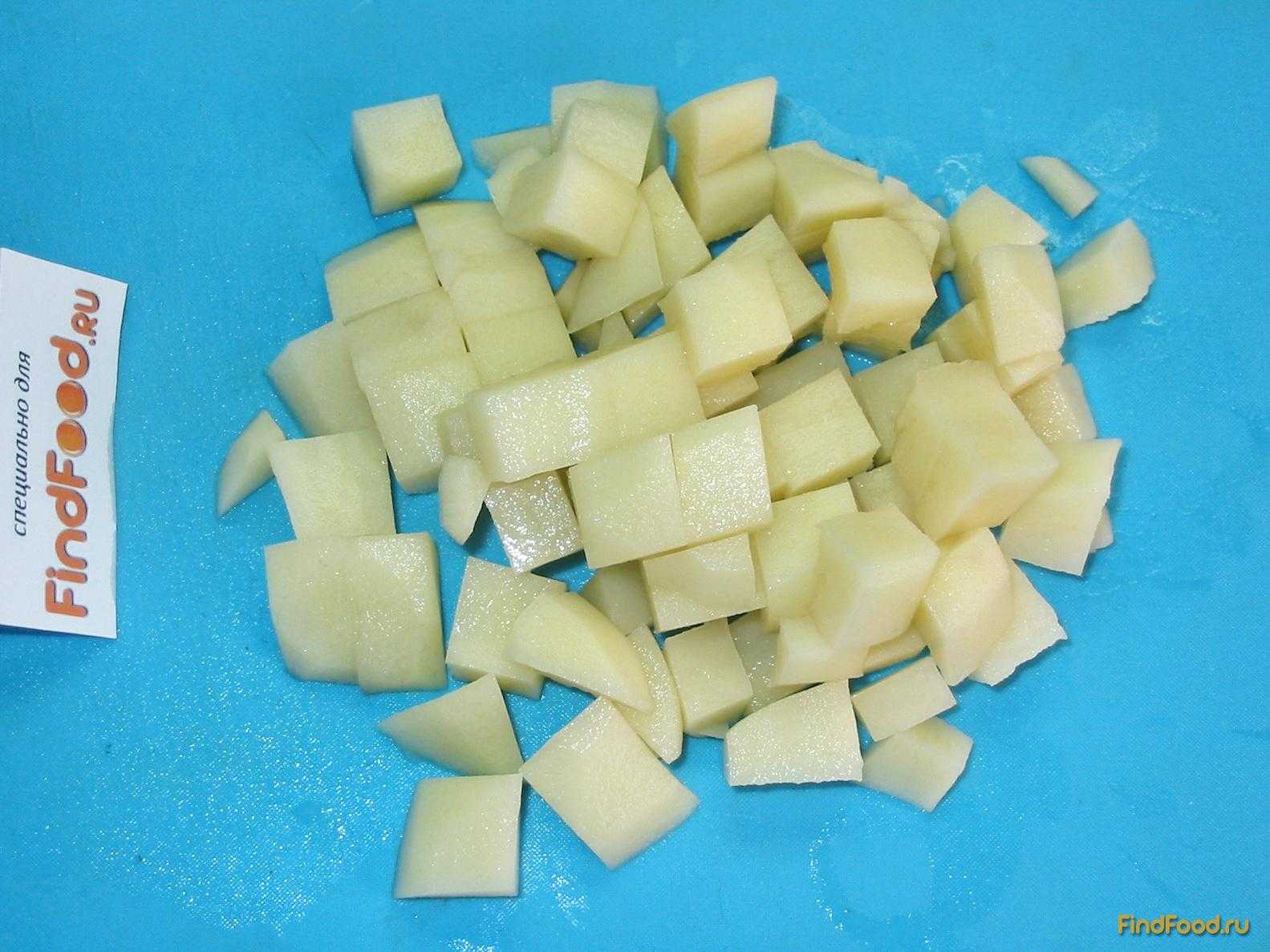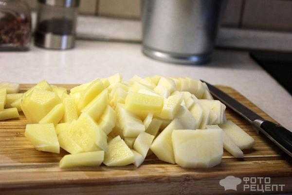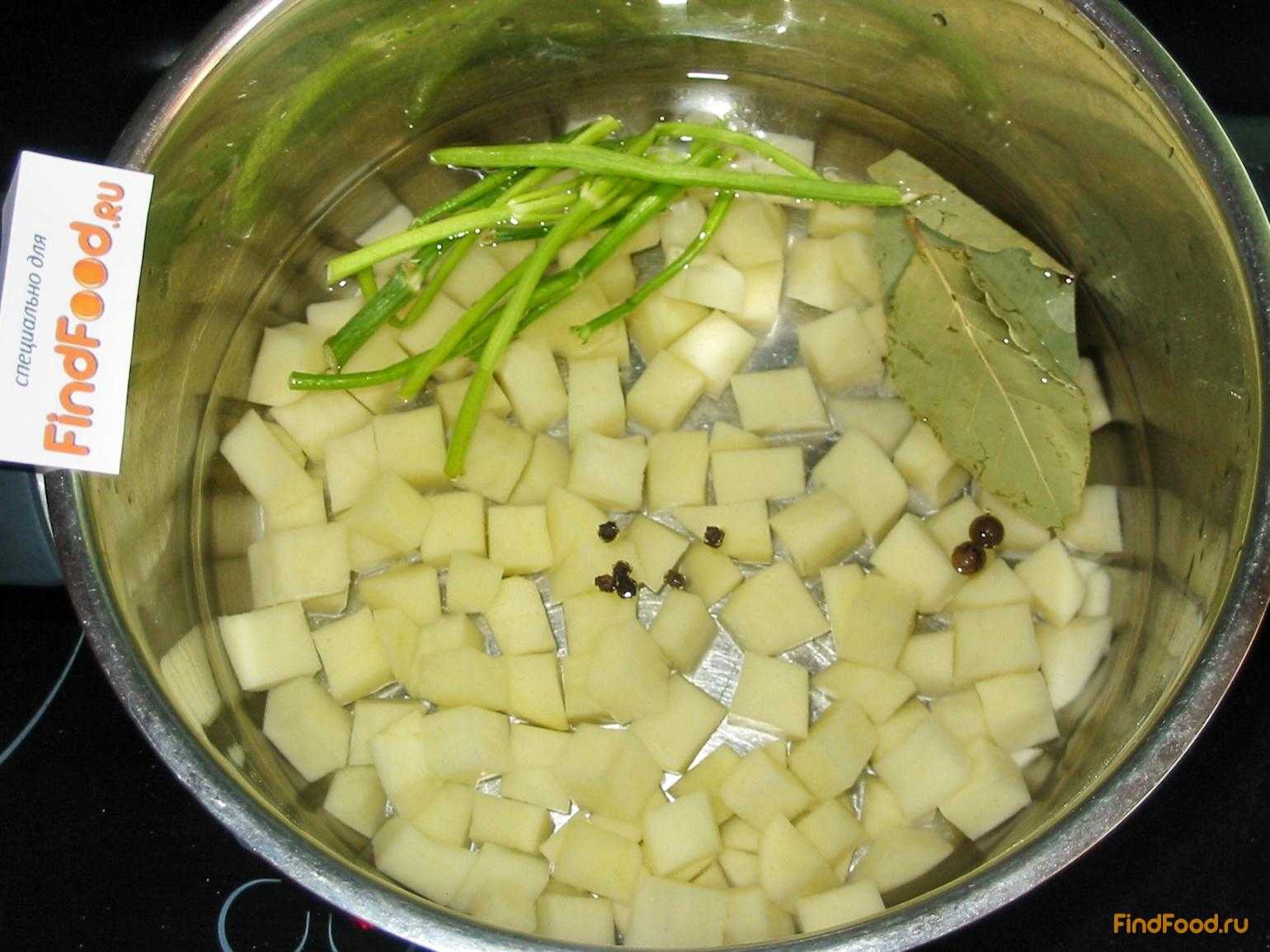 В закипевшую воду отправьте картофельные кубики и горошины перца, варите после закипания минут десять.