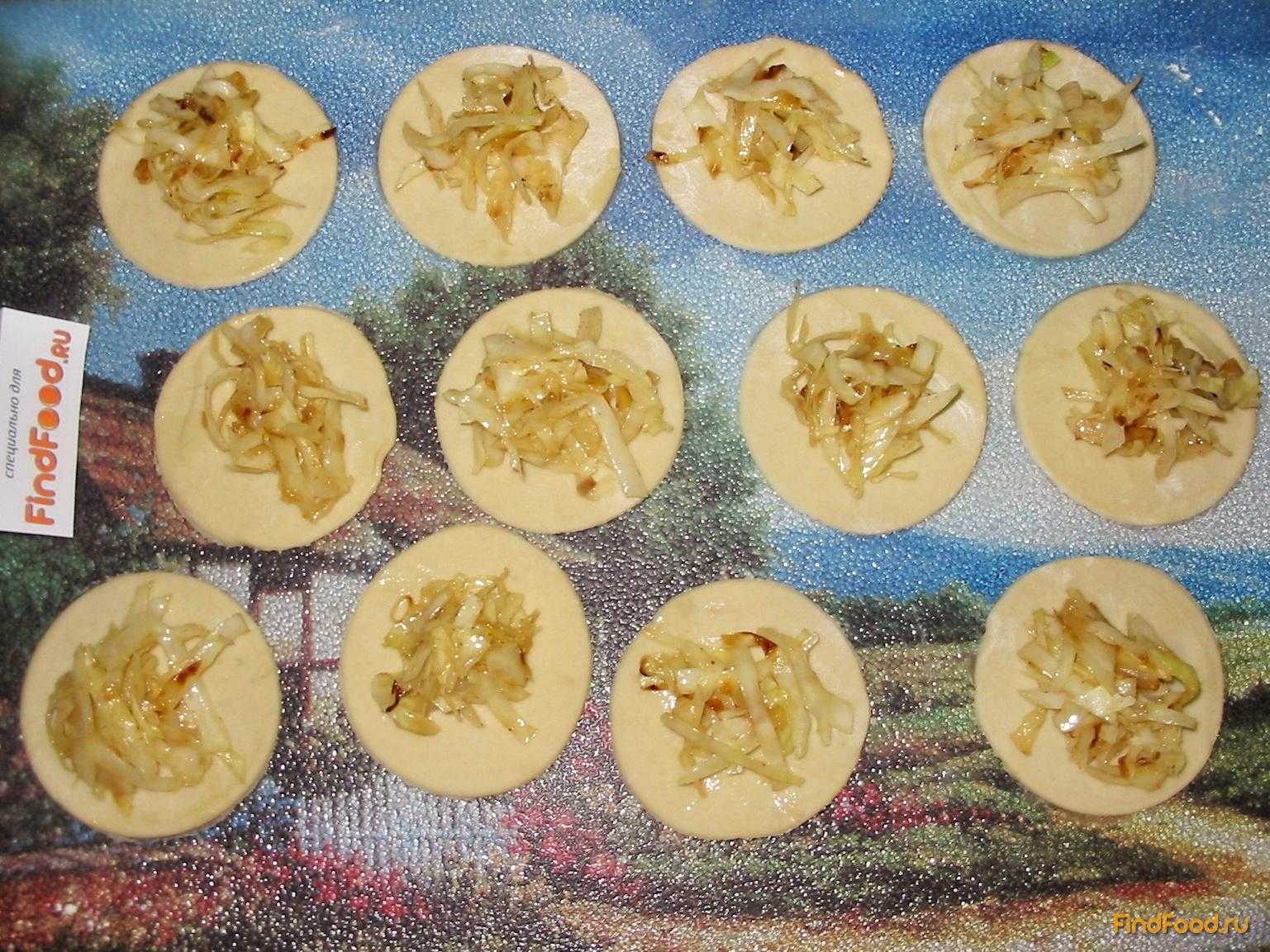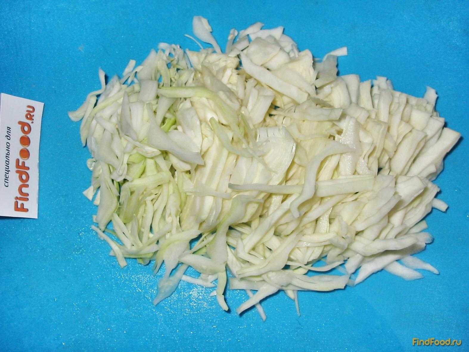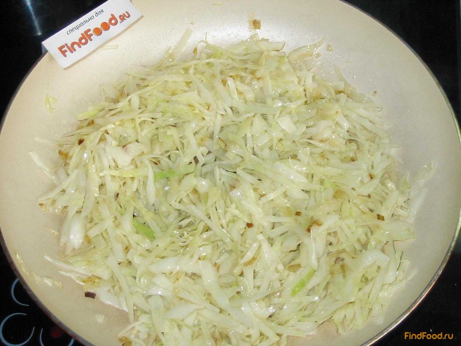 Кладём в сковороду капусту, ещё немного обжариваем её с луком, затем солим и перчим по вкусу, можно добавить универсальную приправу. Тушим капусту до тех пор, пока она не станет мягкой. Убираем сковородку с огня и даём немного остыть.