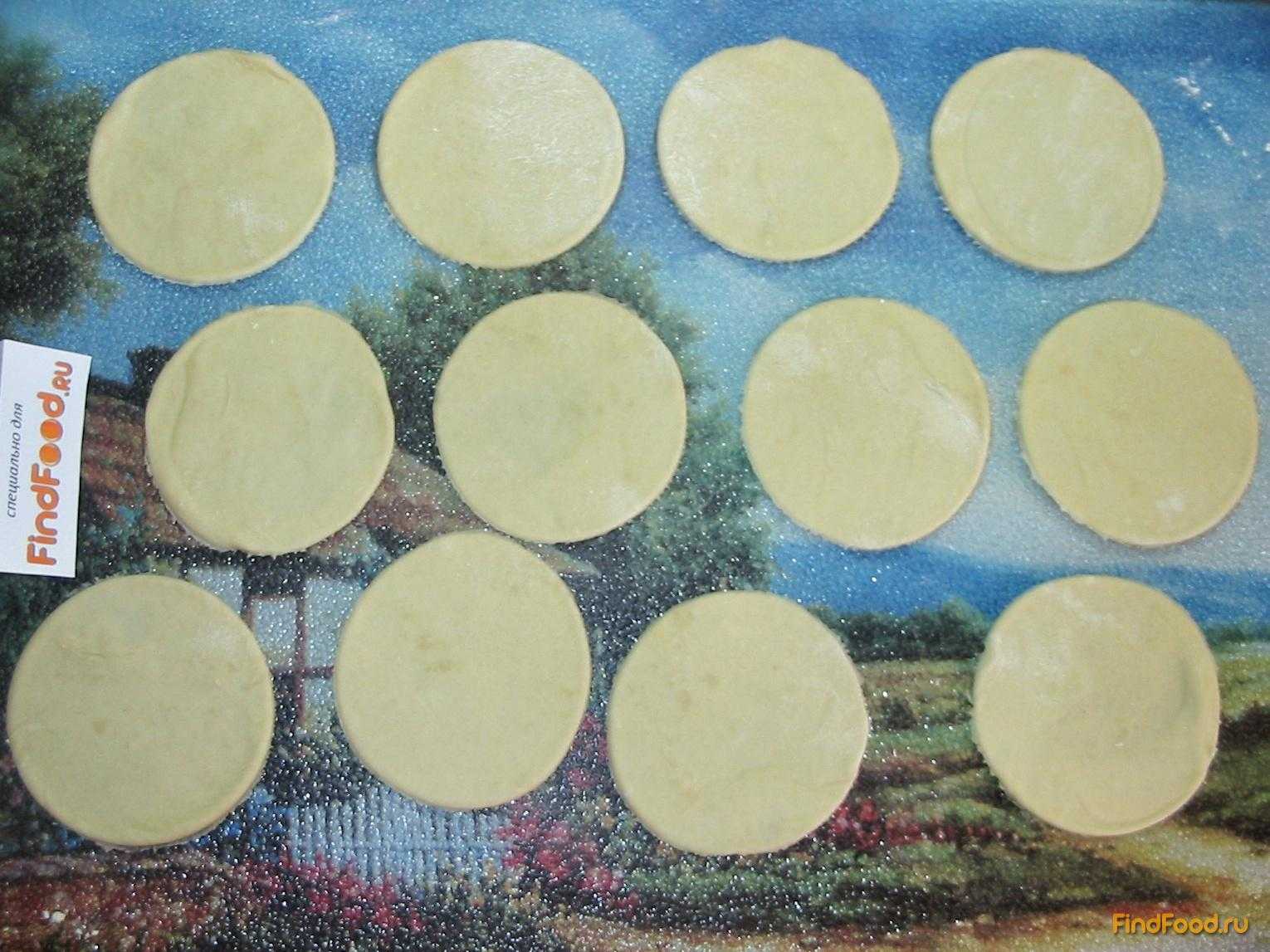 Доску обильно присыпаем мукой и очень тонко раскатываем тесто. С помощью стакана с острыми краями вырезаем из теста круги. Остатки теста собираем и снова раскатываем и вырезаем круги. Так до тех пор, пока не закончится тесто.
