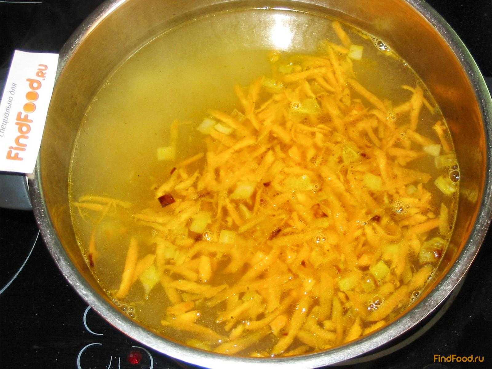- Бульон рекомендуется процедить, чтобы супчик получился прозрачным и аппетитным. В него отправляют грибы и пассированный лук с морковью (обжарить с небольшим количеством масла до золотистого оттенка).