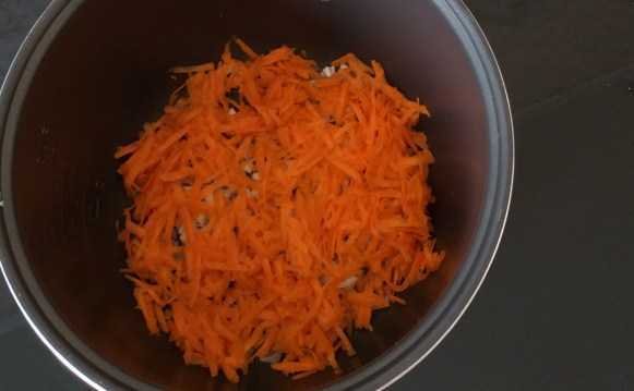 - В чашу мультиварки вливаю столовую ложку оливкового масла и включаю режим жарка. Тем временем очищаю морковь с луком от кожуры и нарезаю кубиками. Когда масло разогреется, выкладываю овощи и обжариваю пять минут.