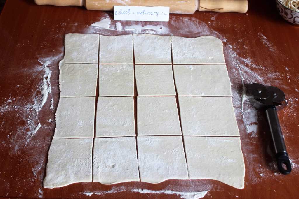 - При помощи острого ножа нарезаем раскатанный пласт на 16 примерно одинаковых квадратов. Готовые слойки будут при этом миниатюрные. Если хотите получить более крупные изделия, то можете сделать 9 заготовок вместо 16!
