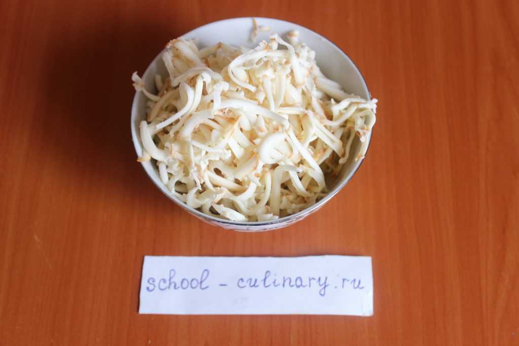 - Таким же нехитрым способом поступаем и с копченым сыром. Отрезаем сыр в необходимом количестве и крупно натираем его.