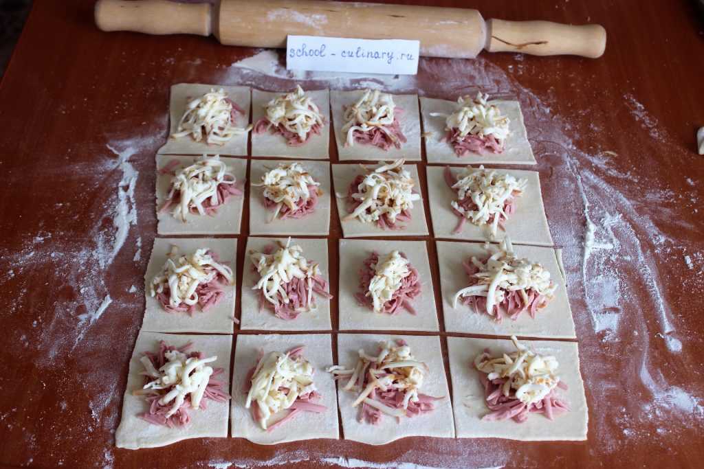 Простой рецепт рулетов из слоеного теста с вареной колбасой и сыром