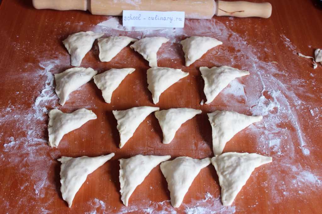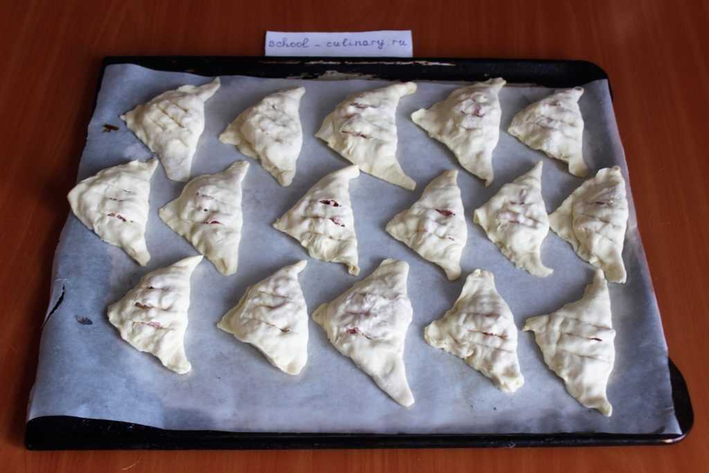 - Противень выстилаем куском пергаментной бумаги для выпечки. Слегка смазываем любым жиром, чтобы готовые слойки лучше было снимать. При желании на поверхности каждого треугольника можно сделать несколько параллельных надрезов. Так выпечка будет выглядеть более интересно.