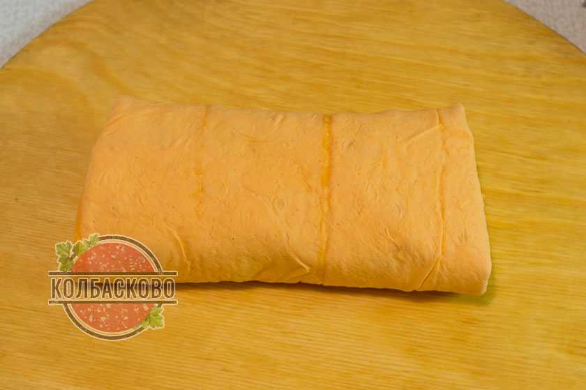 - Разомните тесто еще раз, разделите на 8 частей и каждую раскатайте в пласт толщиной 1–1,5 мм. Чтобы тесто не прилипало к столу и скалке, припорашивайте его мукой.