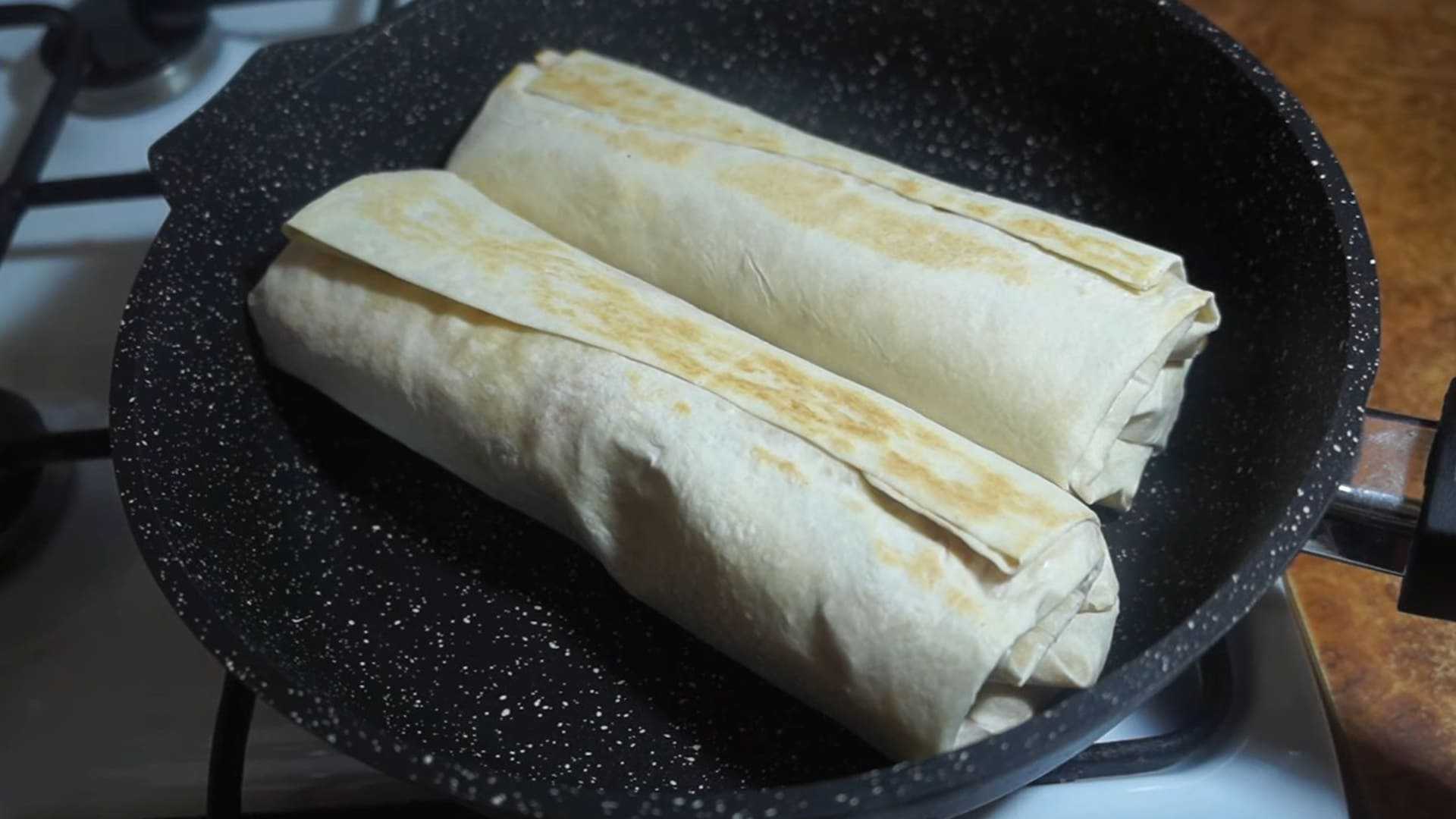 Разогреваем сковороду без добавления растительного масла или любого другого жира. Кладем в нее наш рулетик швом вниз. На высокой мощности поджариваем несколько секунд, пока лепешка не схватится румянцем. Цель — лишь придать лавашу хрустящую корочку. Долго жарить и подогревать ингредиенты внутри не нужно.